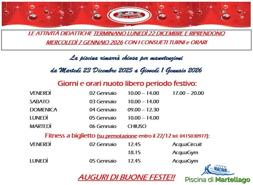 Sospensione attività didattiche e nuoto libero Festività Natalizie 2025 Articolo del 15/12/2025 ‹ › × × Commenti Abilita JavaScript per visualizzare i commenti tramite Disqus.
