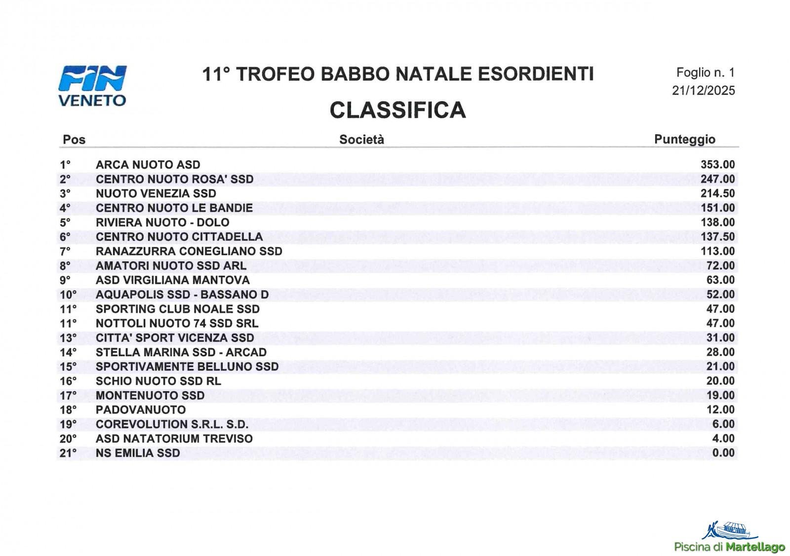 Articolo del 22/12/2025Classico appuntamento regionale riservato alle categorie Esordienti prima di fine anno, 11° Trofeo Babbo Natale è stato vinto anche quest'anno da Arca con 353 punti su 21 società partecipanti, svoltosi presso la piscina di Bassano del Grappa domenica 21 dicembre, Complimenti a tutti gli atleti e i tecnici!
